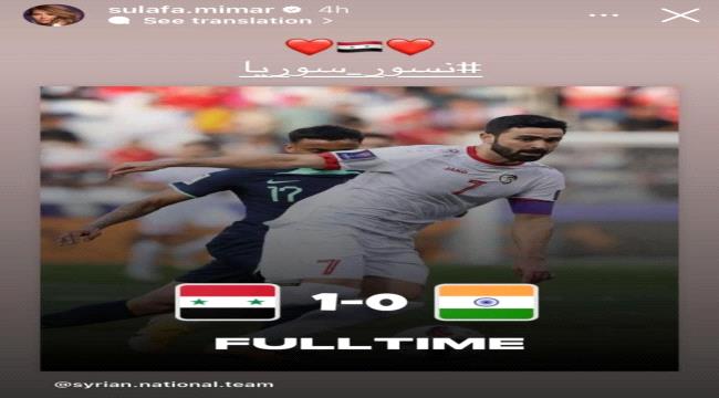 أيضاً شاركت سلافة معمار عبر ستوري حسابها على إنستقرام، صورة النتيجة النهائية لمباراة سوريا والهند وكتبت : "نسور سوريا".