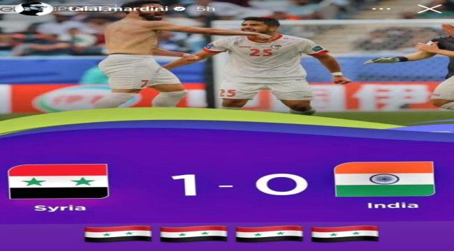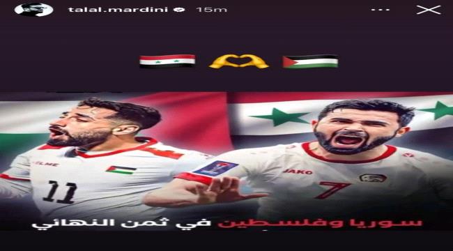 وشارك نجوم سوريا في المباركة للمنتخبين السوري والفلسطيني، حيث نشر طلال مارديني نتيجة فوز منتخب بلاده 1-0 على المنتخب الهندي، عبر ستوري حسابه الخاص على إنستغرام، وشارك صورة أخرى تُبرز تأهل المنتخبين السوري والفلسطيني.