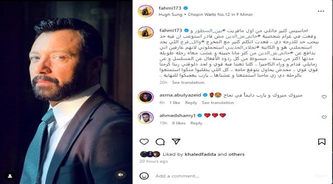 وكتب فهمي، معلقاً على الصورة: "أحاسيس كتير جاتلي من أول ما قريت بين السطور ووقعت في غرام شخصية حاتم عز الدين.. مش قادر أستوعب إن فيه حد بيحب حد للدرجة دي.. قعدت أتكلم مع المخرج وائل فرج اللي بجد استحملني هو والكاتبة نجلاء الحديني استحملوني لأنهم عارفين إني بدافع عن حاتم عز الدين من كتر ما أنا حبيته وعشت معاه رحلة طويلة مدتها أكتر من سنة".