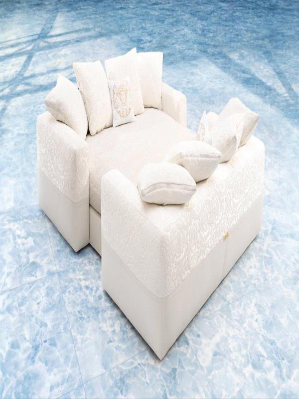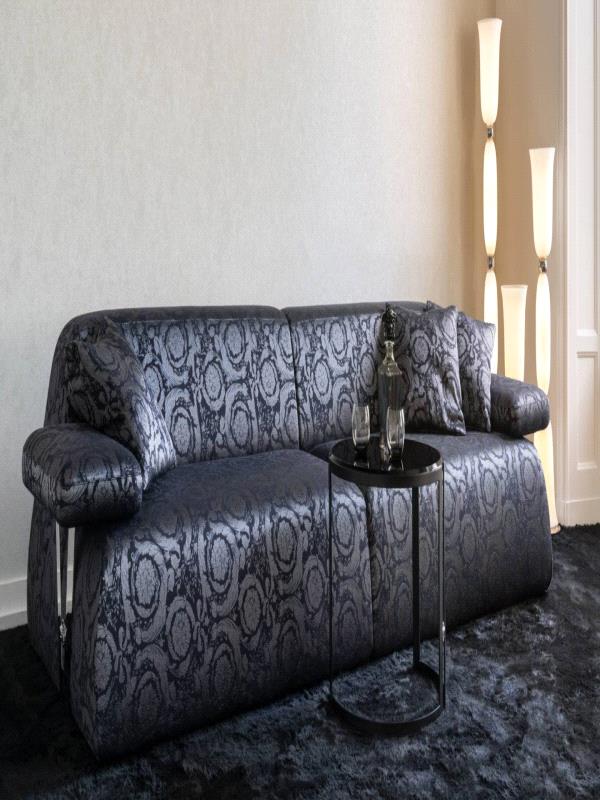 Medusa ’95 Conversation Sofa هي أريكة تشبه السرير الكبير ومفصّلة بزخارف جلدية فاخرة ومساند للذراعين محاطة بوسائد مريحة من قماش الشانيل تتميز بزخارف Barocco من Versace. وهي متوافرة في تصميمين مختلفين، للاستخدام الداخلي أو الخارجي.