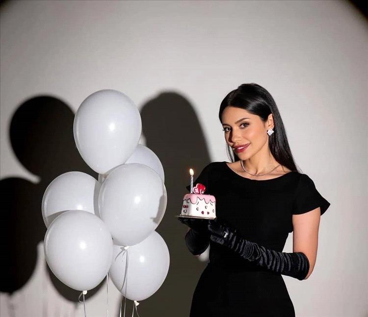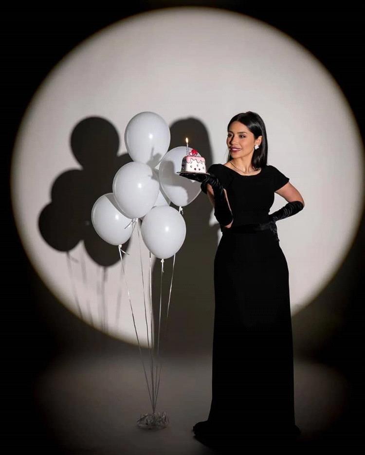واختارت النجمة السعودية لهذه المناسبة فستاناً أنيقاً بتصميم كلاسيكي بصيحة القفازات الطويلة باللون الأسود يبرز أناقتها واحتشامها، وحملت في يدها قالب حلوى صغير مزيناً بشمعة واحدة وزينت المكان بمجموعة من البالونات البيضاء، وبدت في غاية الهدوء والرقي وهي تتفاعل مع الأجواء الناعمة التي اختارتها للاحتفال بميلادها.