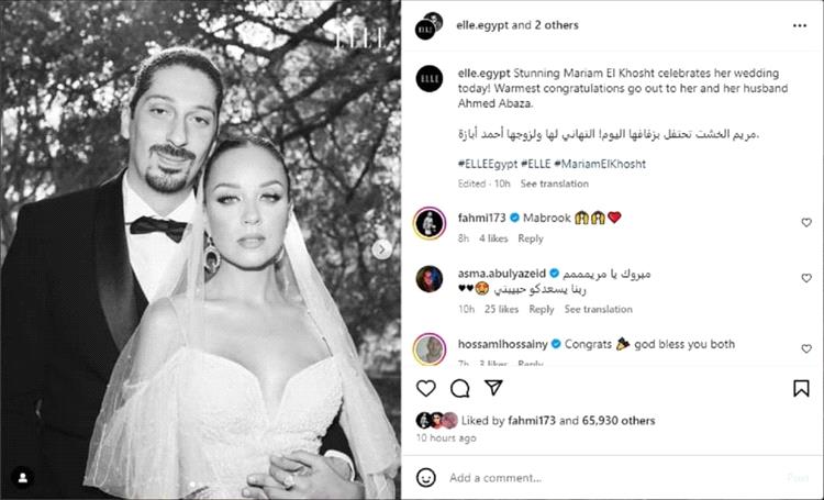 احتفلت الفنانة الشابة مريم الخشت مساء أمس (الخميس) بزفافها إلى شخص من خارج الوسط الفني يُدعى أحمد أباظة، وذلك في أحد الفنادق الكبرى بالقاهرة، وحضر الحفل عدد كبير من النجوم على رأسهم شريف نور الدين وأسماء جلال وكريم قاسم وجميلة عوض وسارة عبد الرحمن وبسنت شوقي.