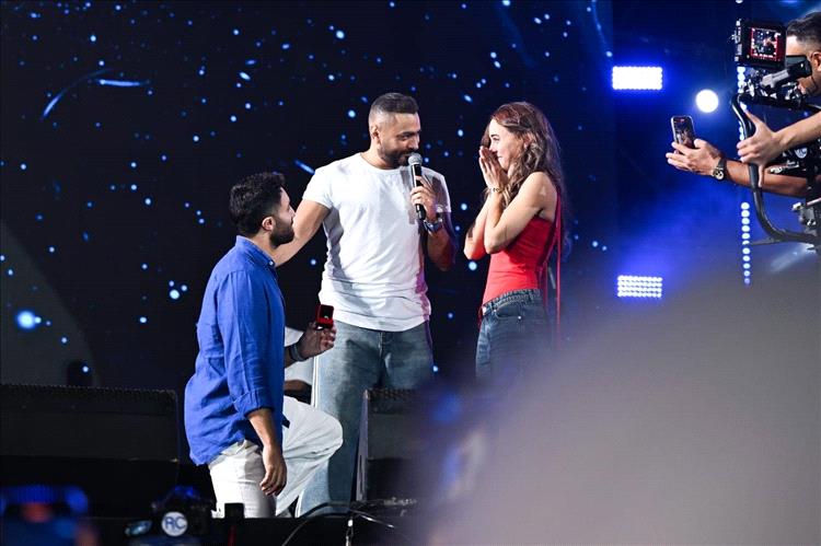كما فوجئ تامر بصعود شاب وفتاة على خشبة المسرح ثم أعلن خطوبتها بتقديم خاتم من الماس لها، وقام تامر حسني، بإعطاء المايك للشاب؛ ليقول كلمته أمام الجمهور، فقال لحبيبته: "تتجوزيني؟"، لتجيب بالموافقة: "أيوه"، فقام تامر بممازحتهما قائلًا: "أيوه إيه.. أنا مش موافق.. اجري اجري".