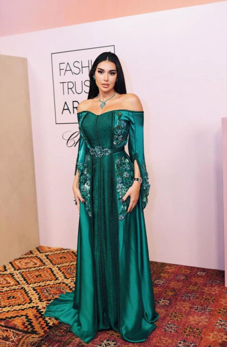 تألقت ياسمين صبري في حفل توزيع جوائز Fashion Trust Arabia في مراكش، بحضور كبار النجوم والمصممين والملوك، حيث ارتدت صبري قفطانًا أخضر زمرديًا مذهلاً من تصميم المصممة المغربية سلمى بن عمر، يتميز بفتحة رقبة على شكل قلب مكشوفة الكتفين وتطريزات زهرية معقدة من الترتر. وأبرزت إطلالتها بحزام أخضر زمردي مزين بإبزيم من أحجار الراين. واكتملت إطلالتها بمجوهرات شوبارد الأنيقة بألوان متناسقة، بما في ذلك عقد من الماس والزمرد وأقراط وساعة. اختارت صبري إطلالة برّاقة منعشة مع قاعدة متوهجة وأحمر شفاه وردي رقيق وشعر أملس مفرود.