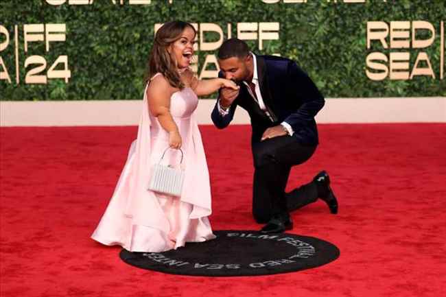تقدّم فهمي من مريم وهي تمر على السجادة الحمراء ليمسك بيدها وينحني ليقبّلها ثم يقف ليلتقط الصور معها دعماً لها في يوم العرض العالمي الأول لفيلمها، ضمن فعاليات "مهرجان البحر الأحمر السينمائي".