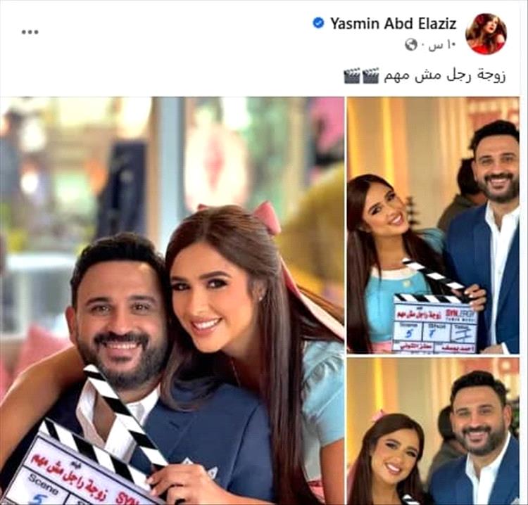وظهرت ياسمين في الصور بجانب أكرم حسني وهي تمسك الكلاكيت في يدها، وعلّقت على الصور بقولها: "زوجة رجل مش مهم".