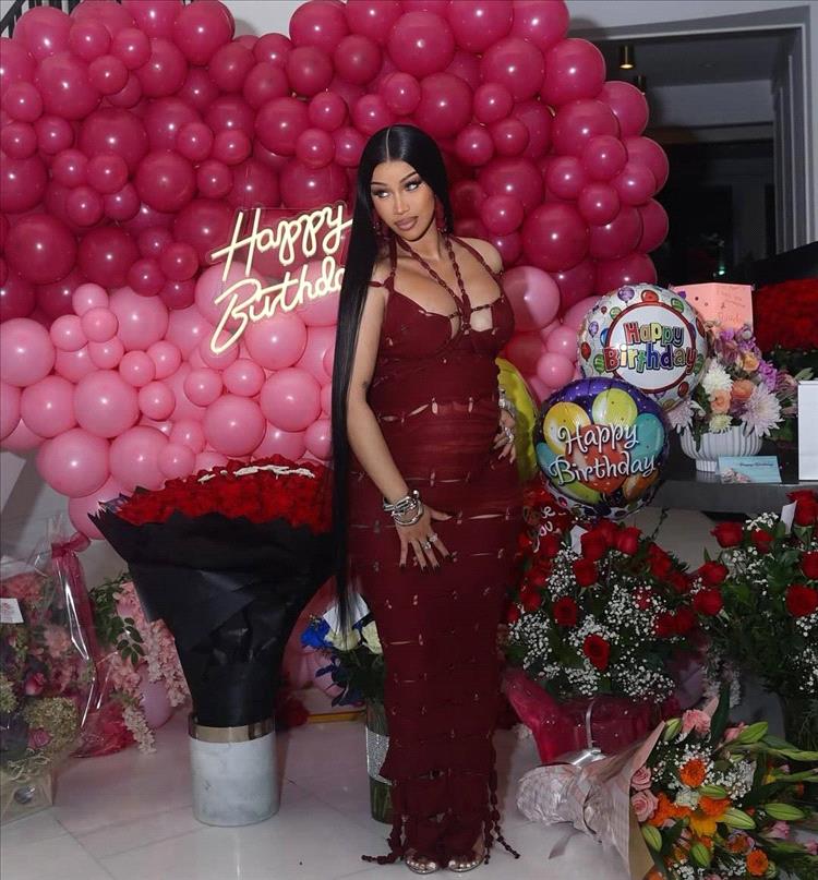 اختارت المغنّية كاردي بي للاحتفال بعيد ميلادها الثالث والثلاثين فستاناً ضيّقاً يبرز حملها بطفلها الرابع وبتصميم بسيط ومكشوف.