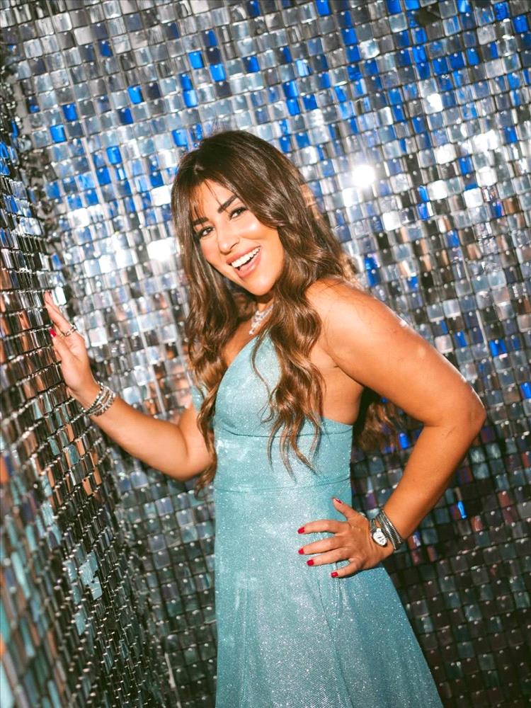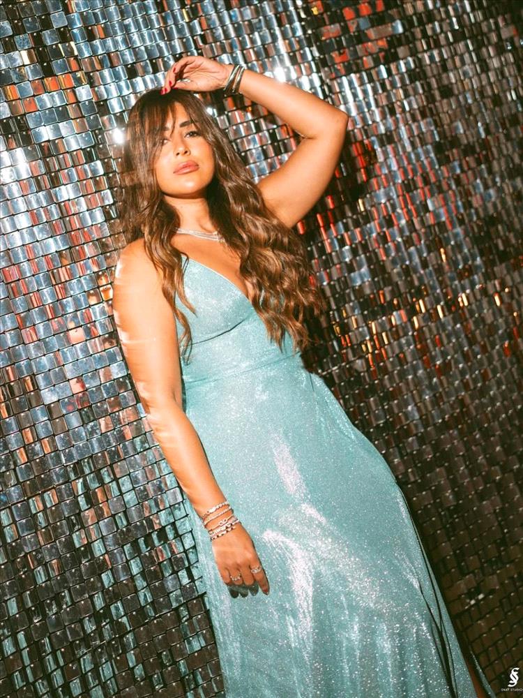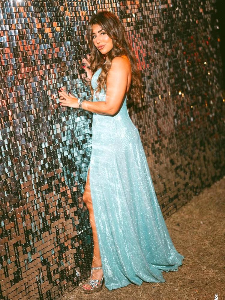 وارتدت النجمة المصرية فستاناً متلألئاً باللون الفيروزي المبهر، جاء بتصميم ضيّق من الأعلى وبحمّالات رفيعة تلتفّ عالرقبة، مع فُتحة V جريئة عند الصدر، وينسدل من الأسفل بقصة واسعة مع فُتحة جانبية عالية، تمنحها المزيد من الأنوثة والجرأة.