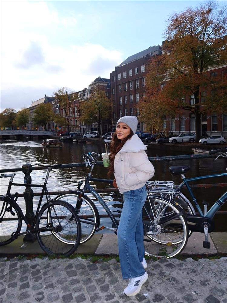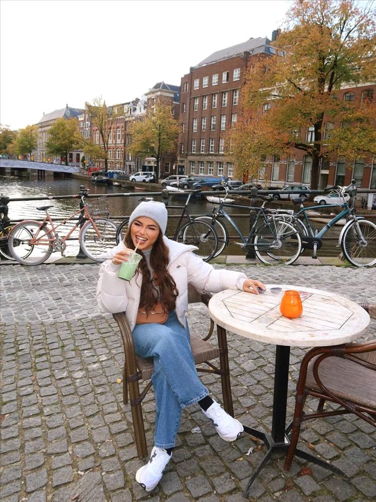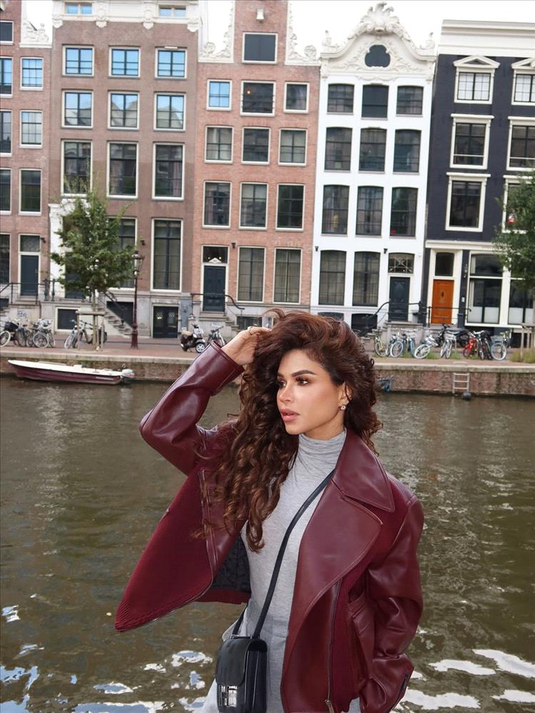 ولفتت نهى نبيل الأنظار في أمستردام بإطلالة كاجوال أنيقة عبارة عن بنطال من القماش بتصميم واسع القدمين باللون الرمادي الفاتح ومعه توب شتوية خفيفة بياقة عالية باللون نفسه، ونسّقت معهما جاكيت قصيرة من الجلد باللون العنابي بياقة عريضة لافتة. ونسّقت ملابسها مع حقيبة كروس صغيرة الحجم باللون الأسود.