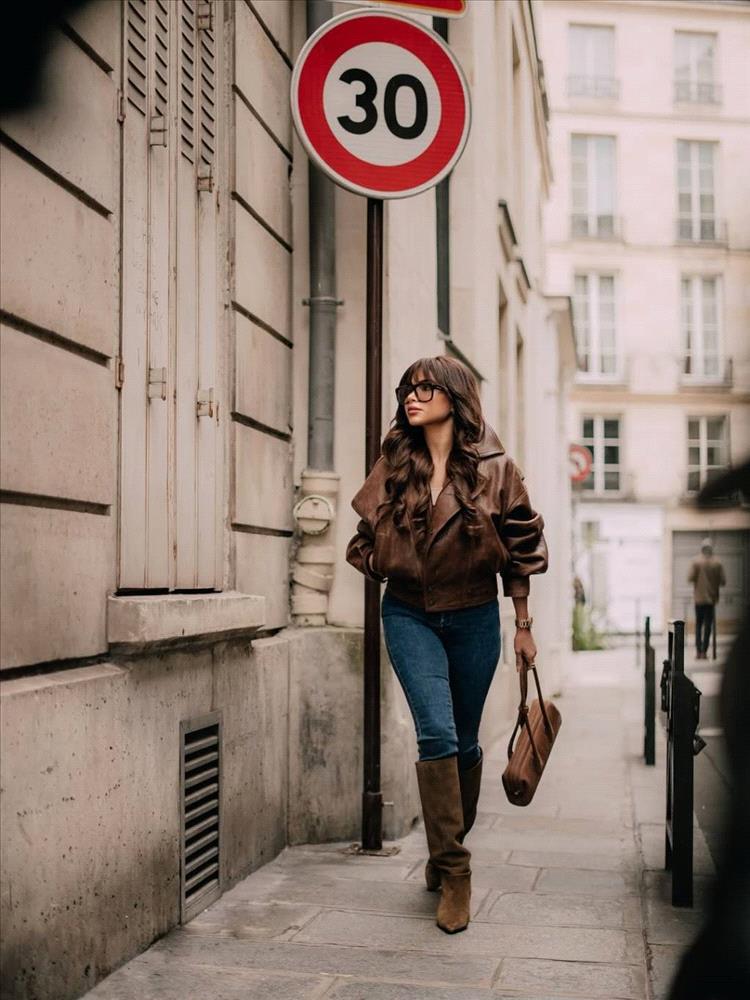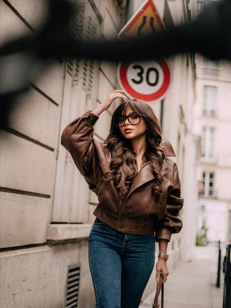 إطلالة ناعمة بجاكيت من الجلد الفخم