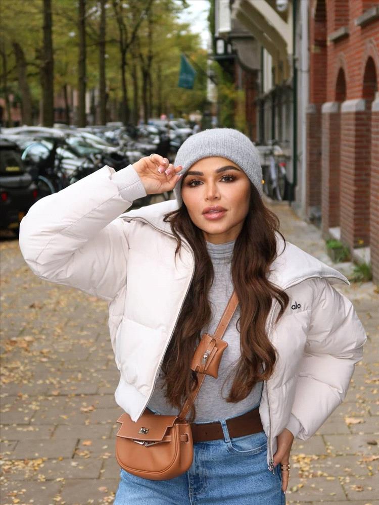 وفي إطلالة أخرى تعتمد الستايل نفسه، اختارت نهى نبيل بنطالاً من الجينز بقصة كلاسيكية مع توب خريفية باللون الرمادي الفاتح، ونسّقت معهما جاكيت "بف" قصيرة باللون الأبيض، وحملت حقيبة بتصميم "كروس" باللون البنّي الفاتح واعتمرت قبّعة من الصوف باللون الرمادي، في إطلالة شتوية بامتياز تناسب الأجواء الأوروبية.