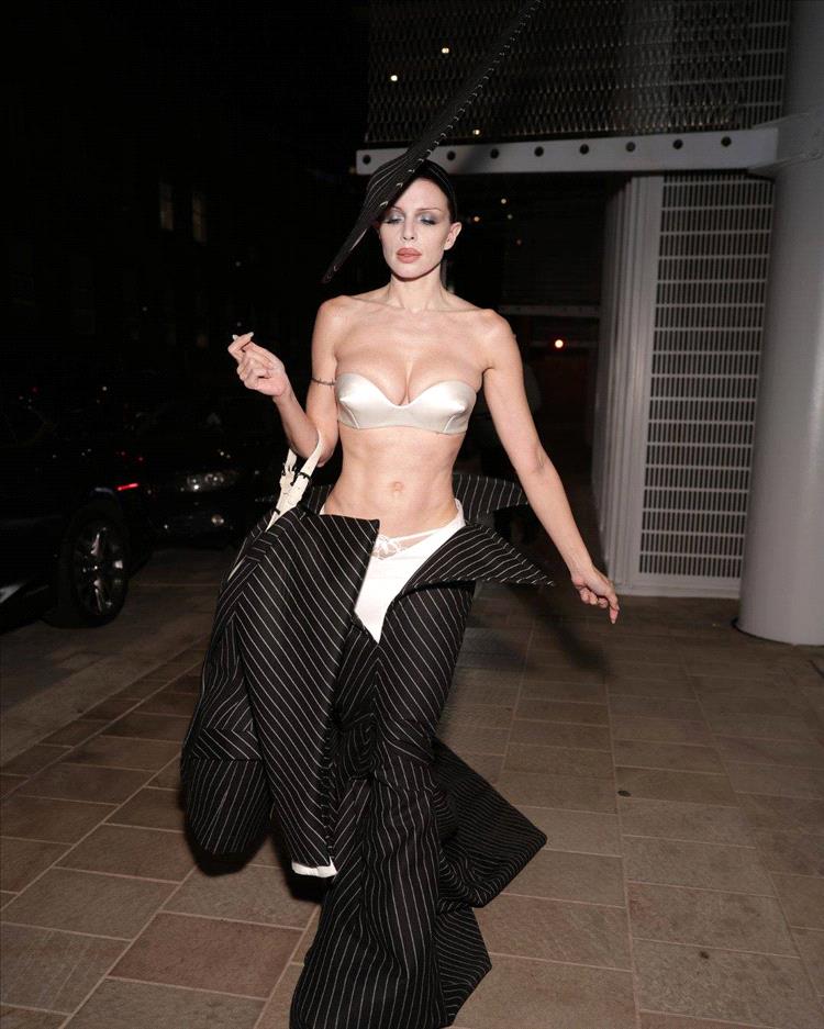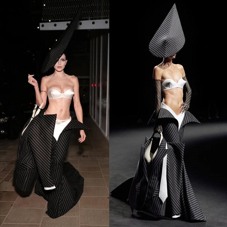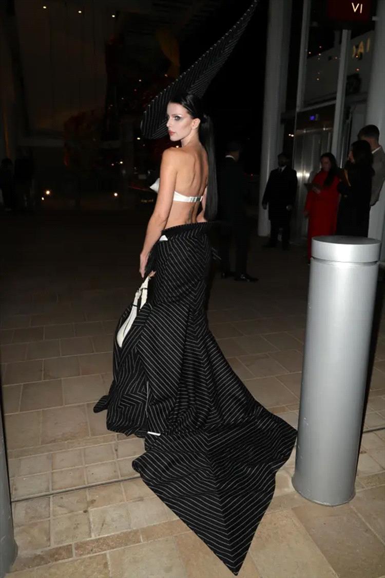 خطفت الممثلة البالغة من العمر 35 عاماً الأنظار بفستانها النحتي المذهل من مجموعة روبرت وون لأزياء خريف 2025 الراقية، والذي تضمّن حمّالة صدر مخروطية من الساتان العاجي، وقميصاً داخلياً أبيض، وقبّعة سوداء وبيضاء طويلة بخطوط رفيعة بدت وكأنها جاهزة للإقلاع.