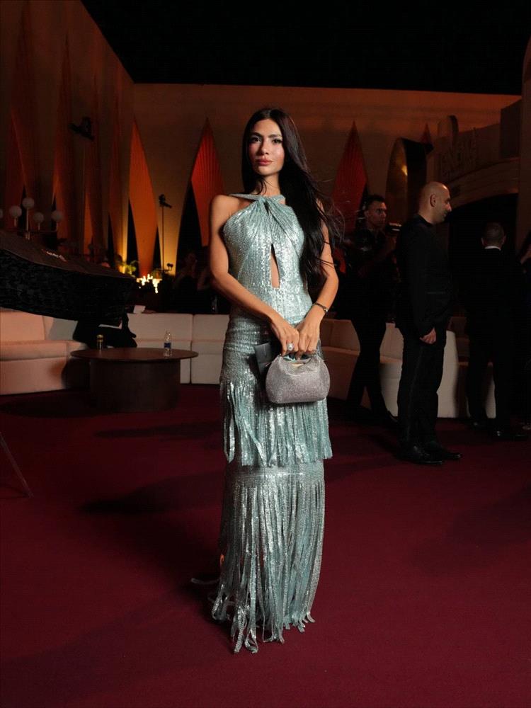 هدى المفتي اختارت فستاناً أزرق برّاقاً بتنورة تتدلّى منها شراريب ناعمة أضفت بعداً حيوياً على الإطلالة. أما رزان جمال فبدت كتمثال ذهبيّ أنيق بفستانٍ مرصّع بالترتر بقصّة انسيابية راقية. في المقابل، اختارت تارا عماد فستاناً بلون زهري مائل إلى النيود مع تفاصيل شفّافة زادت من أنوثة الإطلالة من دون أن تفرّط في الجرأة.