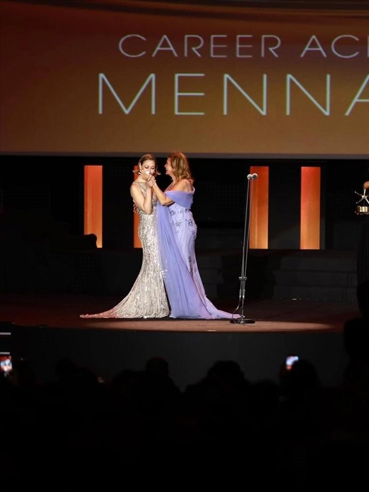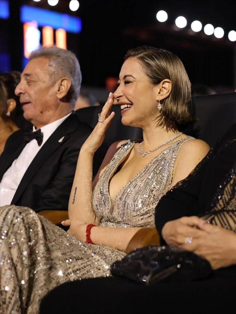 وتسلّمت شلبي جائزة التميز عن مشوارها الفني الناجح، وتألقت بفستان من الترتر الفضّي بقصة طويلة منسابة وياقة مفتوحة على شكل V.