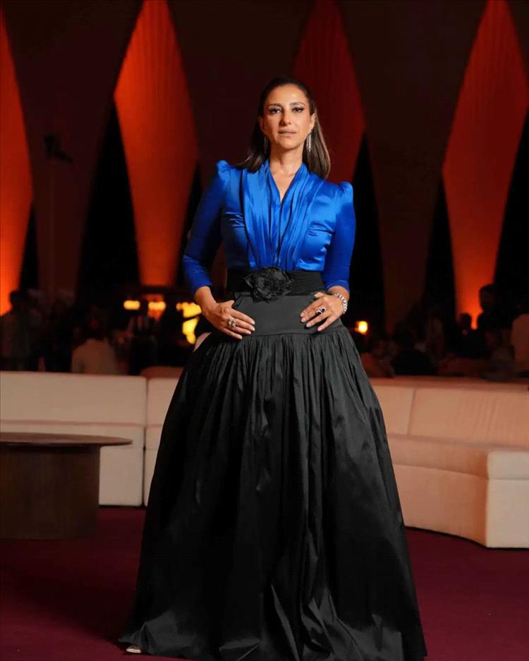 أطلت حنان مطاوع بإطلالة تحمل توقيع الأناقة الكلاسيكية، مكوّنة من تنورة سوداء واسعة وقميص حريري أزرق بستايل ملفوف، مع حزام مزين بوردة تضيف لمسة أنثوية راقية.