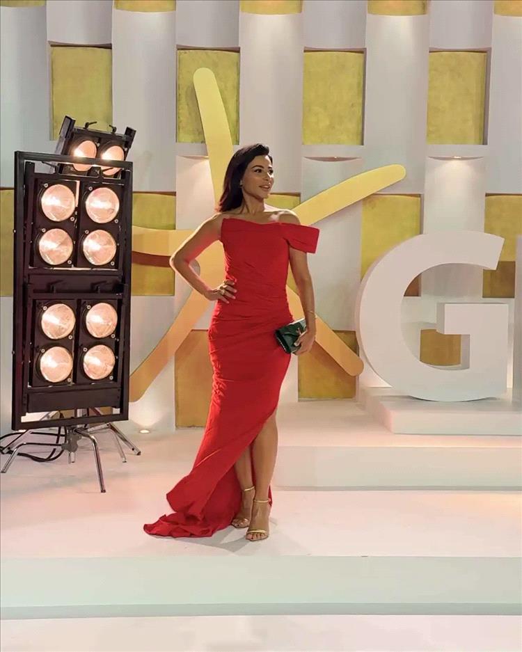 أبهرت مهيرة الحضور بفستان أحمر سترابلس بكتف واحد، مزود بشق أمامي طويل وتصميم غير متماثل. حافظت على البساطة في الإكسسوارات لإبراز الفستان.