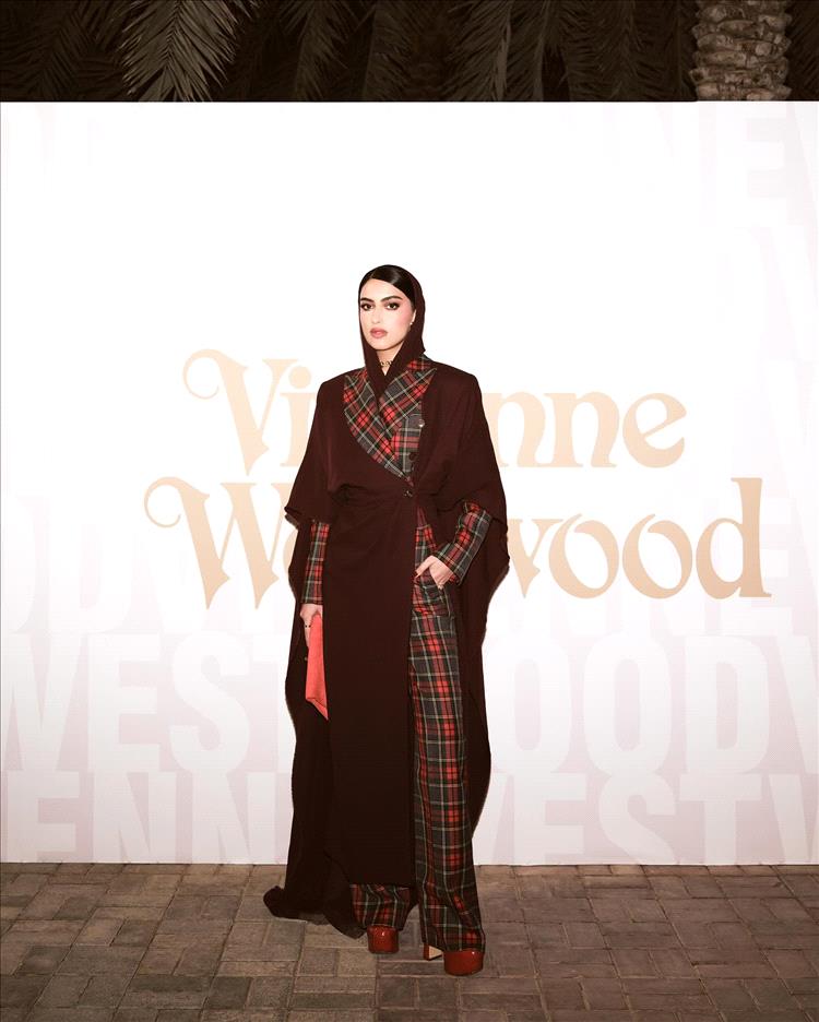 المدوّنة يارا النملة أعادت إحياء الخطوط التراثية بلمسة حديثة من خلال معطف طويل باللون العنابي الغامق مزين بنقشة مربعات كلاسيكية. أكمَلت إطلالتها بحقيبة حمراء صغيرة ووشاح عنّابي على الرأس، لتُقدّم صورة راقية عن الأناقة المحافظة التي تعكس عمق الهوية السعودية.