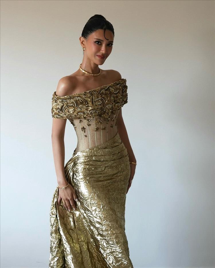 في لحظة من الفخامة البصرية، ظهرت النجمة زينب البلوشي بفستان ساحر باللون الذهبي من تصميم عدنان أكبر، حمل قصّة "أوف شولدر" مزخرفة بالخرز والأحجار البارزة. الفستان تميّز بـكورسيه شفاف يعكس حرفية التصميم، فيما زادت مجوهرات Bvlgari من رقيّ الإطلالة، لتبدو زينب كنجمة ذهبية في سماء الرياض.