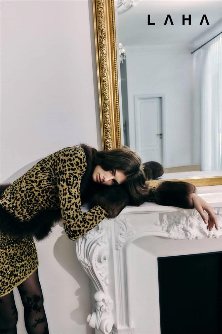كارديغان بنقشة النمر، مزيّن بالريش وأكمام من الفرو، وتنورة بنقشة النمر، Collant من Valentino