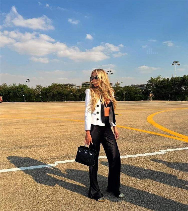 وظهرت مايا دياب كذلك ببدلة أنيقة وجريئة عبارة عن بنطال أسود مع بلايزر قصير أبيض اللون مع ياقة سوداء ومزيّنة بأزرار كبيرة باللون الأسود، ونسّقتهما بتوب قصيرة بتصميم (صدرية) سوداء.