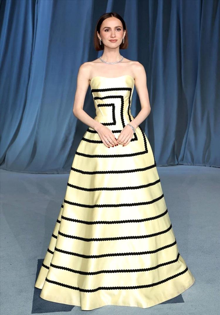 اختارت النجمة مود أباتو فستاناً أنيقاً من "برادا" من الساتان الأصفر، ومزيناً بتطريز هندسي باللون الأسود من قماش غروسغرين بليسيه. أضفت الأنماط الهندسية لمسة ريترو ساحرة على الإطلالة، تجمع بين العصرية والحداثة. وجاء الفستان من دون أكمام وضيّقاً من الأعلى وينسدل من الأسفل بتنورة واسعة مميزة، وتزينت بمجوهرات ماسية ناعمة.