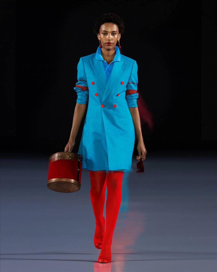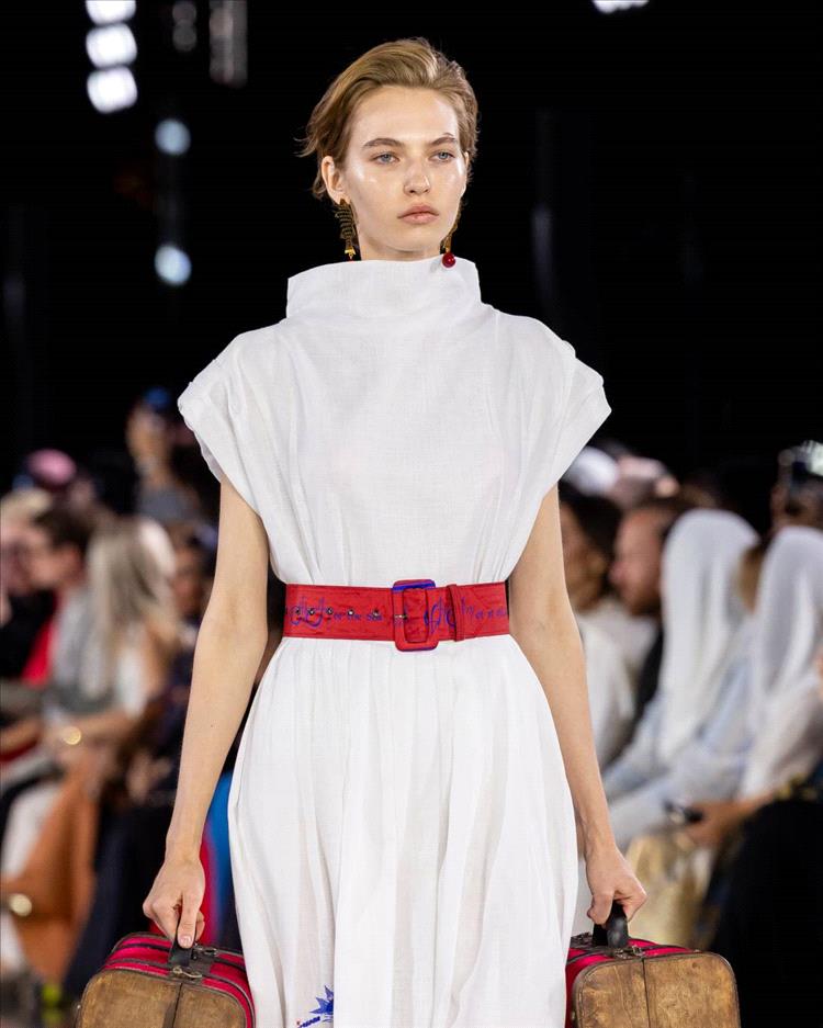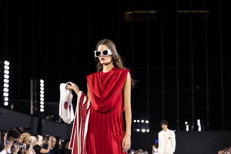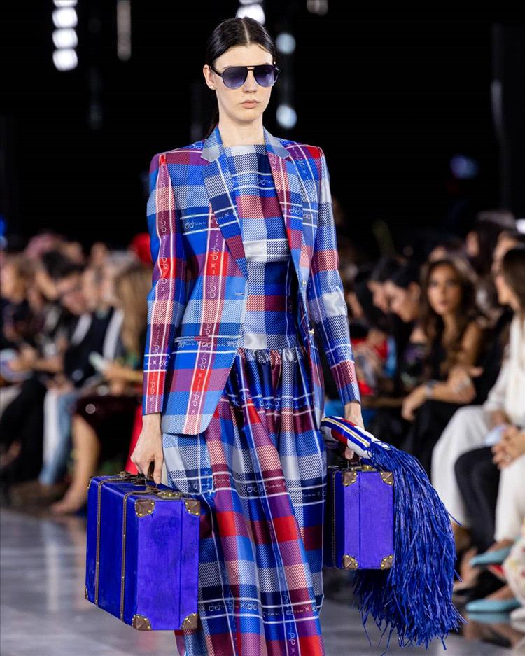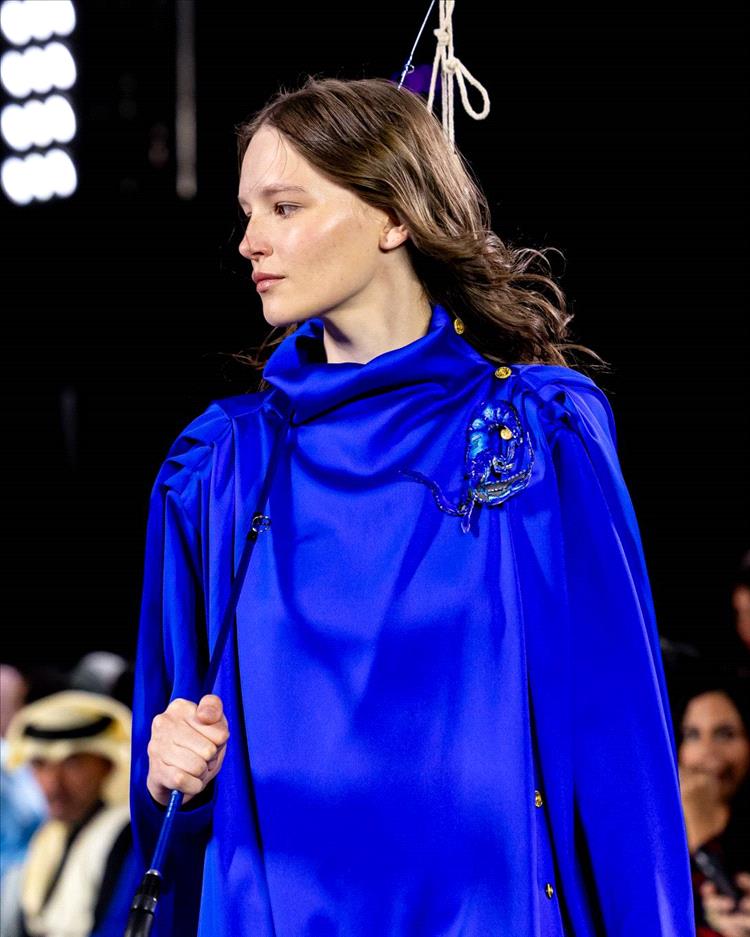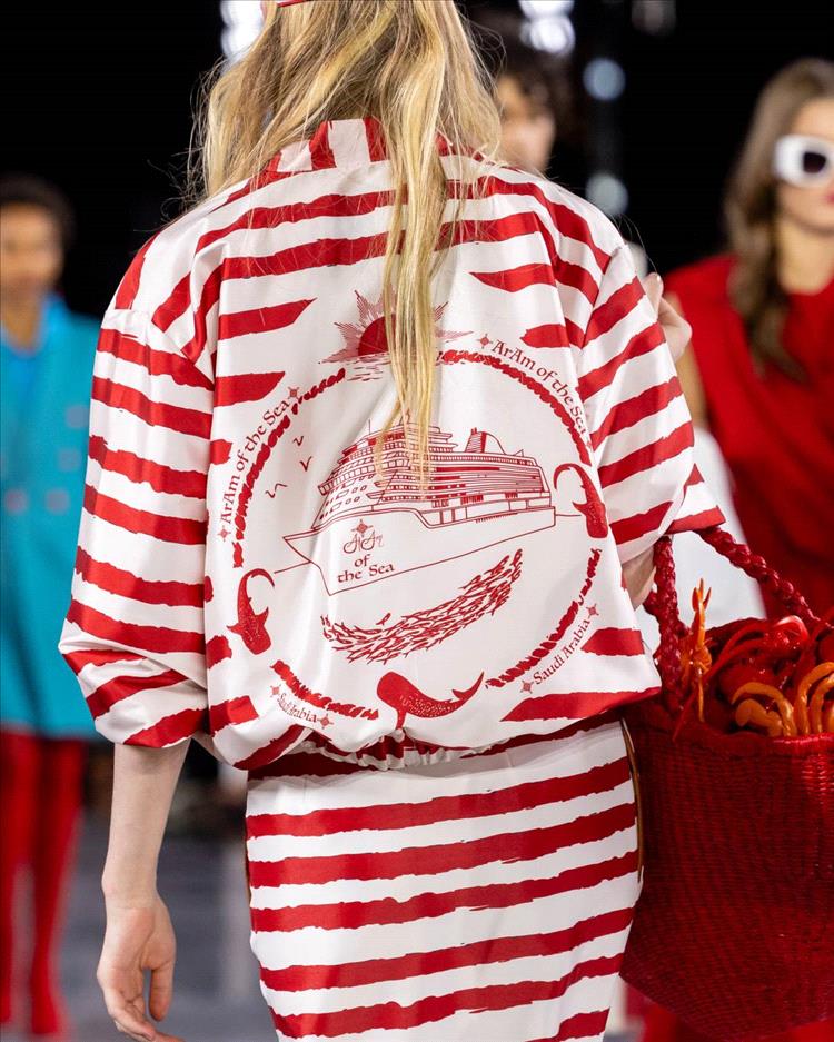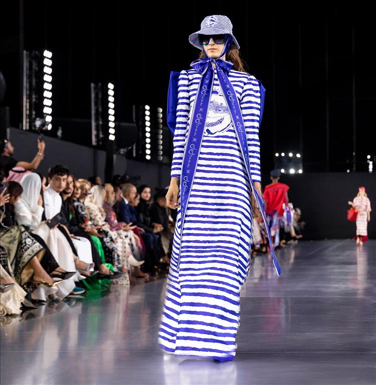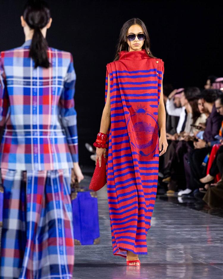 أما المصمّمة المبدعة أروى العماري فقدّمت من خلال علامتها Aram مجموعة مبهرة تجسّد لوحة ألوان قوية ومنعشة تليق بأجواء الاحتفالات الصيفية والإطلالات النهارية والمسائية، وسيطرت درجات البنفسجي الهادئ والأخضر النعناعي والأزرق المشرق، إلى جانب لمسات من الأحمر القوي، على المنصة، مما خلق تناغماً بصرياً جذاباً. كذلك تداخلت التصاميم بأسلوب هندسي مدروس في نقوش وخطوط متناغمة، عاكسةً حيوية التصميم، في أجواء مليئة بالطاقة والإيجابية.
