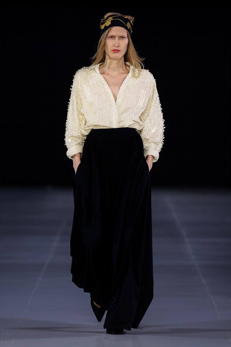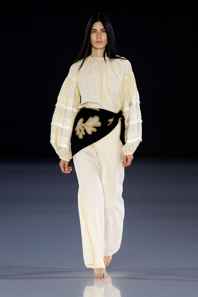 والى جانب الفساتين، برزت الملابس المكوّنة من بنطلون بقصة البرمودا مع توب بتطريزات ناعمة بألوان مبهرة، والتفتّ حول خصرها قطعة قماش منسدلة باللون الوردي الفاتح، لتخلق ذيلاً طويلاً وشكلاً فريداً، يجمع بين الفخامة والعملية.