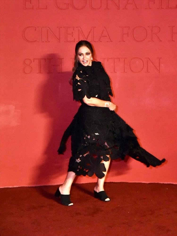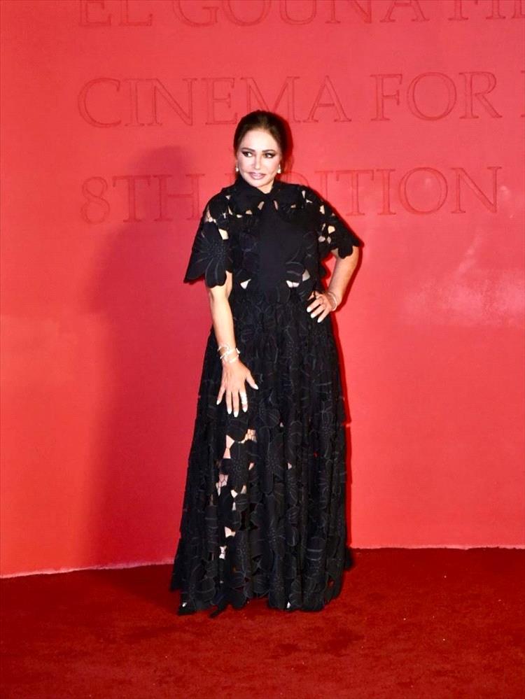 اختارت الفنانة ليلى علوي فستاناً ناعماً وطويلاً باللون الأسود تميز بقماشه المخرّم بالكامل، ونسّقت تحته تنورة باللون الأسود، وجاء بتفاصيل أنيقة أضفت لمسة من الفخامة على إطلالتها، وانتعلت صابو نسائياً ناعماً، وتزيّنت بمجوهرات تناسب طلّتها البهية.
