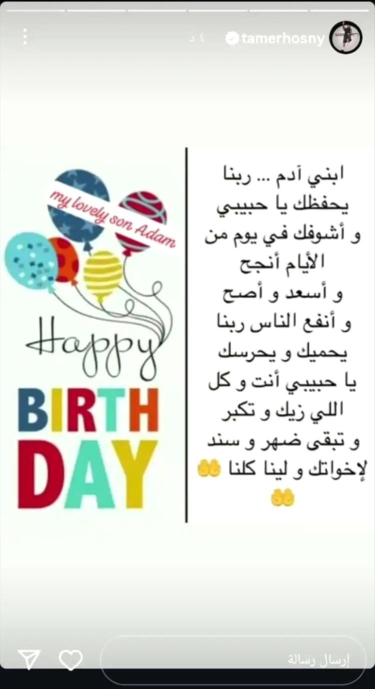 ووجّه تامر عبر خاصية القصص المصوّرة الملحقة بحسابه الخاص في "إنستغرام" رسالة مليئة بالمشاعر الأبوية قال فيها: "ابني آدم... ربنا يحفظك يا حبيبي وأشوفك في يوم من الأيام أنجح وأسعد وأصح وأنفع الناس، ربنا يحميك ويحرسك يا حبيبي أنت وكل اللي زيّك، وتكبر وتبقى ظهر وسند لإخواتك ولينا كلنا. ابني الحبيب آدم، عيد ميلاد سعيد".