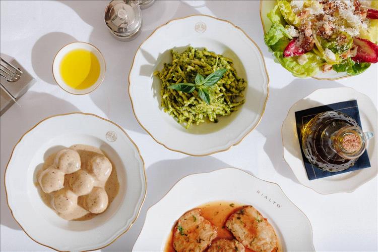 يتميز مطعم "ريالتو" بموقعه الفريد في قلب المنتجع، ويجمع بين التصميم المستوحى من الطراز المعماري لمدينة البندقية والأطباق الغنية بنكهات الشمال الإيطالي، وسط أجواء راقية تحتفي بالعصر الذهبي لإيطاليا. ويشرف الشيف التنفيذي للمنتجع روبيرتو ريسبولي على إعداد قائمة غداء العمل بعنوان برانزو أوكلوك، التي تمّ تحضير أطباقها بعناية لتلائم وتيرة أيام العمل، إذ تضم خيارات واسعة من السلطات الموسمية الطازجة وأصناف الباستا المميزة والتي يتم إعدادها بجانب الطاولة، إلى جانب تشكيلة مختارة من أجود أنواع اللحوم والمأكولات البحرية.
