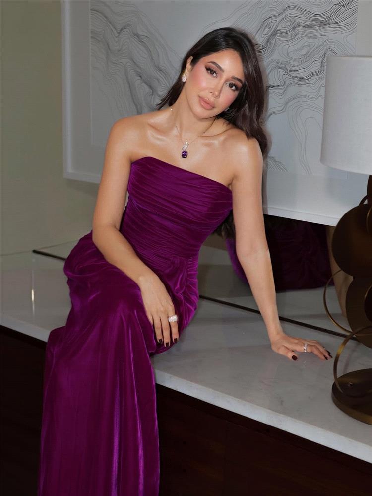 لفتت النجمة السعودية أسيل عمران الأنظار أخيراً بإطلالة أنيقة وغاية في الرقي، حيث اختارت فستاناً باللون البورغندي بتوقيع شربل كرم كوتور. تميّز التصميم بطابع "سترابلس" يكشف عن الأكتاف بأسلوب أنثوي جذّاب، وبقصّته الطويلة والضيّقة التي أبرزت قوامها برقيّ وأناقة لافتة.