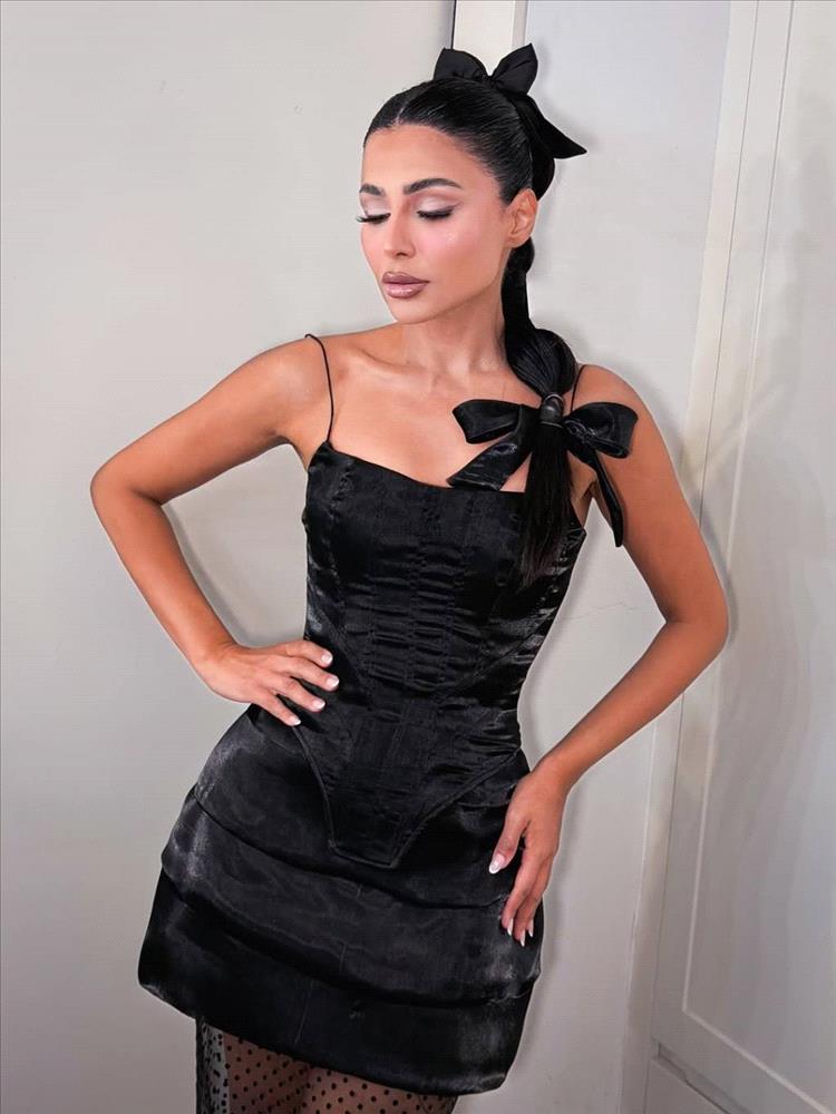 من الناحية الجمالية، رفعت مهيرة شعرها إلى الأعلى بطريقة مشدودة مع فرق وسطي، مما أبرز ملامح وجهها بوضوح وأناقة. وزيّنت التسريحة بلمسة فريدة من خلال عقد الـ Bow الممتد من الأعلى إلى الأسفل، وهو تفصيل مميز أضفى على الإطلالة طابعًا أنثويًا ناعمًا واحتفاليًا في الوقت نفسه.