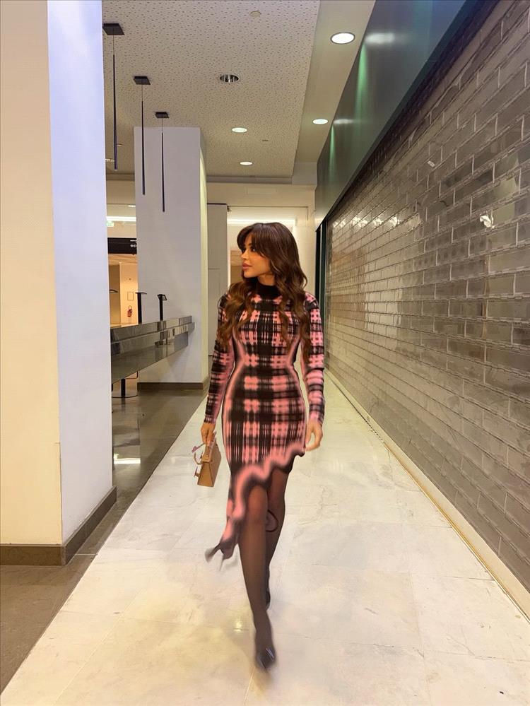 واختارت البلوغر الكويتية فستاناً ناعماً بتداخل اللونين الأسود والزهري على شكل مربّعات متناثرة وخطوط ورسوم مبهرة، وجاء بتصميم مجسّم يبرز رشاقتها وبأكمام طويلة مع قبّة دائرية ناعمة، وينسدل عند الفخذ بقصة جانبية غير متماثلة بتموجات هادئة أضافت لمسة من الفخامة والعفوية الى التصميم. ونسّقت مع الثوب "كولون" شفّافاً وبلايزر كلاسيكية باللون الأسود.