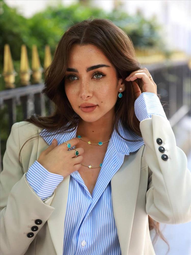 اختارت هنا الزاهد أن تُطلّ بأسلوب يجمع بين الرصانة والأنوثة عبر طقم باللون البيج تألّف من جاكيت وبنطلون بتصميم كلاسيكي أنيق. ولكسر حيادية الإطلالة، أضافت لمسة لونية ناعمة من خلال قميص أزرق بتقليمات رفيعة، منحها مظهراً عصرياً أنيقاً من دون أن يطغى على الطابع الهادئ للإطلالة. أكملت هنا إطلالتها بنظّارات شمسية باللون البنّي عكست ثقة وشخصية قوية، مع حقيبة محايدة اللون أضافت توازناً جميلاً بين البساطة والفخامة. هكذا جمعت النجمة المصرية بين روح الموضة الحديثة وأناقة الإطلالات الكلاسيكية التي لا تبهت بمرور الزمن.