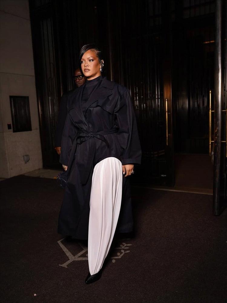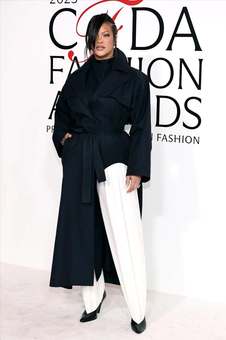 على الرغم من أنها كانت مجرد مرافقة في هذا الحدث البرّاق، إلا أن إطلالة ريهانا من تصميم Ala�a كانت الأجمل بلا منازع. ارتدت مؤسّسة Fenty Beauty نسخة عصرية من بدلة "زوت سوت" التي تعود إلى ثلاثينيات القرن الماضي، عبارة عن معطف أسود طويل بفُتحة جانبية تبرز منها ساق بنطالها الواسع. وانبثق البنطال عاجي اللون من حذاء أسود بكعب عالٍ.