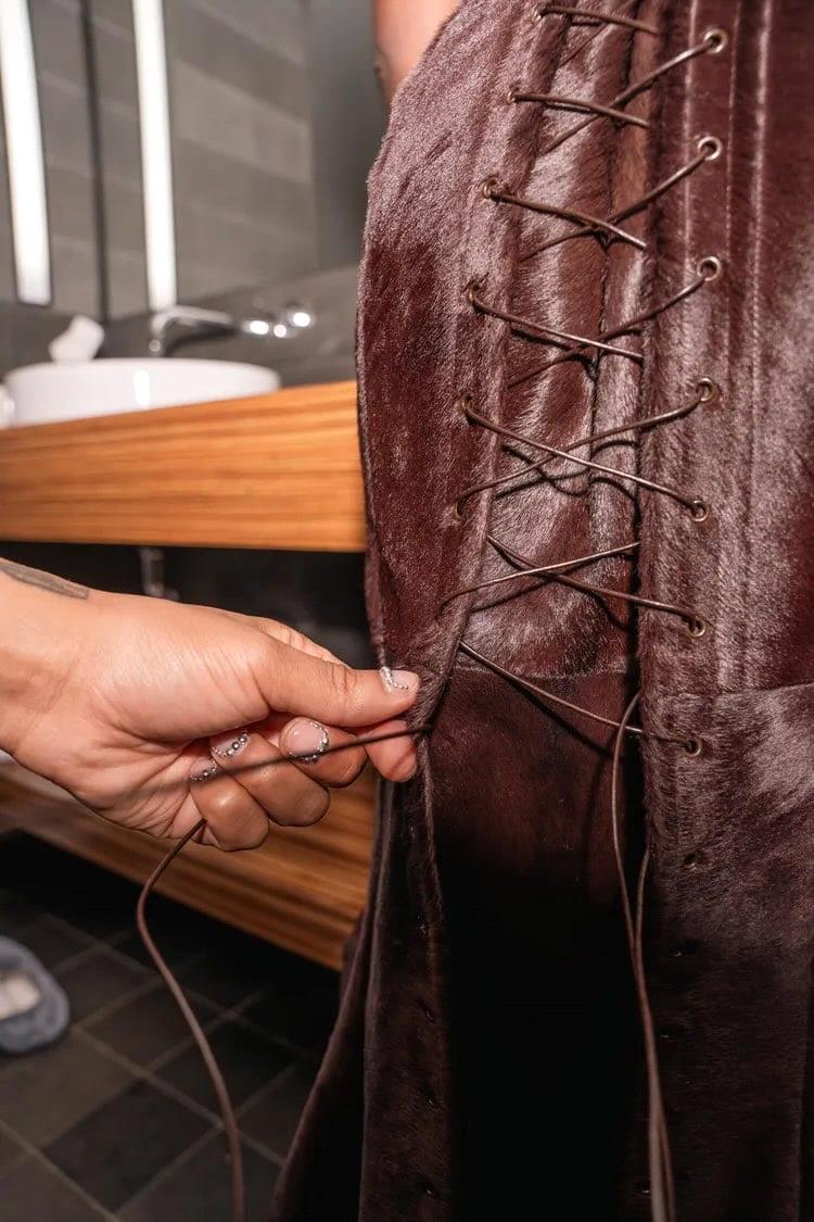 لإطلالة مميزة، اختارت أولاندريا صديقها والمتعاون معها براندون بلاكوود لتصميم فستان بنّي مخصّص من فرو المهر مع قصة ضيّقة عند الخصر وفُتحة جانبية عالية، وحقيبة Vanity Kendrick Trunk جديدة تماماً (300 دولار).