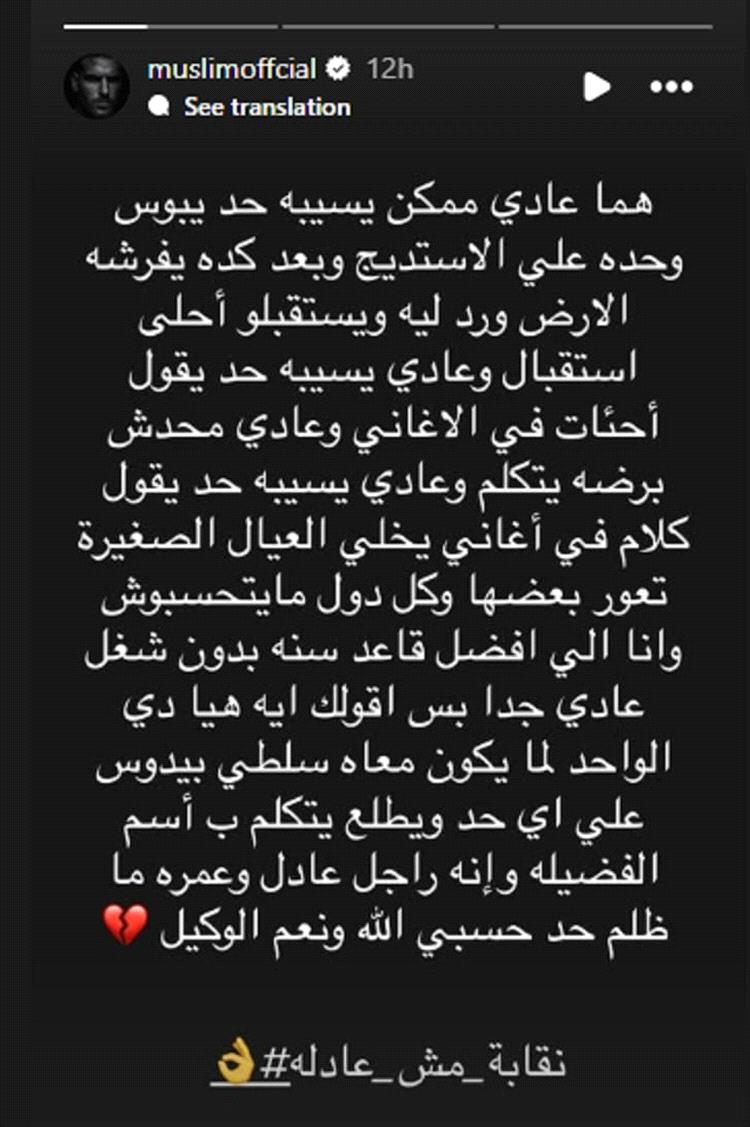 وكتب مسلم عبر خاصية القصص المصوّرة الملحقة بحسابه الخاص في "إنستغرام" منشوراً عالي النبرة، وجّه من خلاله اتهامات صريحة الى النقابة بـ"الكيل بمكيالين"، متسائلاً عن سبب إيقافه في الوقت الذي تتغاضى فيه النقابة عن مخالفات أخلاقية وفنية جسيمة يرتكبها فنانون آخرون.