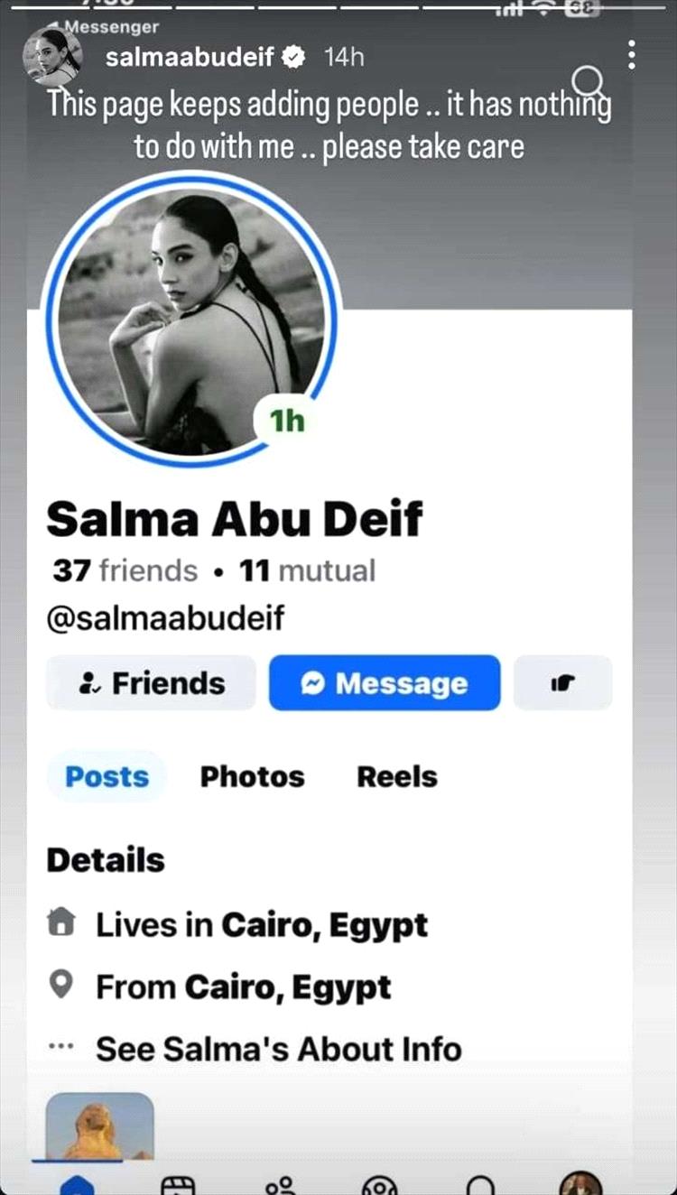 ونشرت سلمى صورة للصفحة المنتحلة شخصيتها، مع التعليق: "هذه الصفحة تضيف أشخاصاً باستمرار... لا علاقة لي بها... يرجى توخّي الحذر".