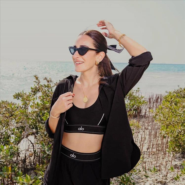 اختارت أمينة اللوك الأول من مجموعة Yoga Set باللون البيج، المؤلف من كروب توب موقّع من العلامة مع ليغينغ ضيق ذي خصر عالٍ من اللون نفسه، ما منحها مظهراً متناسقاً وأنيقاً. وأكملت إطلالتها بجوارب رياضية عالية وحذاء باللون البيج الفاتح والغامق، مما أضاف لمسة رياضية أنثوية.