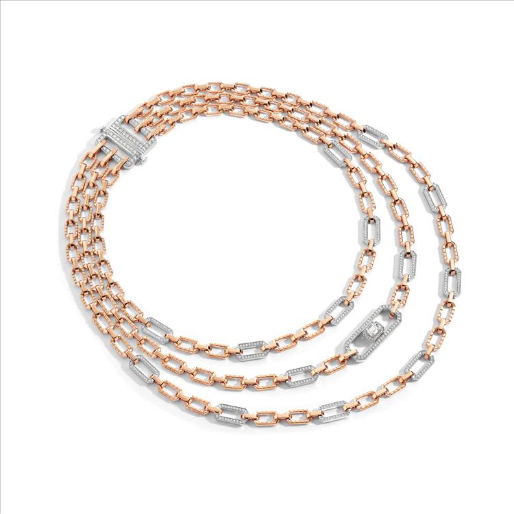 تستوحي المجموعة خطوطها من العظمة المعمارية لمدينة نيويورك، وتعيد ترجمتها عبر تصاميم هندسية دقيقة تدمج بين الذهب الأبيض والوردي مع الماس بأسلوبٍ متقنٍ يجمع القوة والرقة في آنٍ واحد.