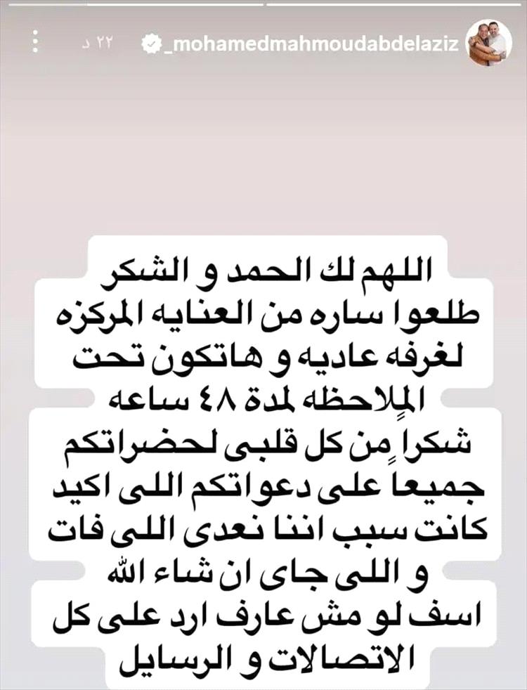 وعاد محمد محمود عبد العزيز لينشر منشوراً آخر كشف فيه عن تطورات الحالة الصحية لزوجته، وطمأن خلاله متابعيه قائلاً: "اللهم لك الحمد والشكر، طلعوا سارة من العناية المركزة لغرفة عادية، وهتكون تحت الملاحظة لمدة 48 ساعة".