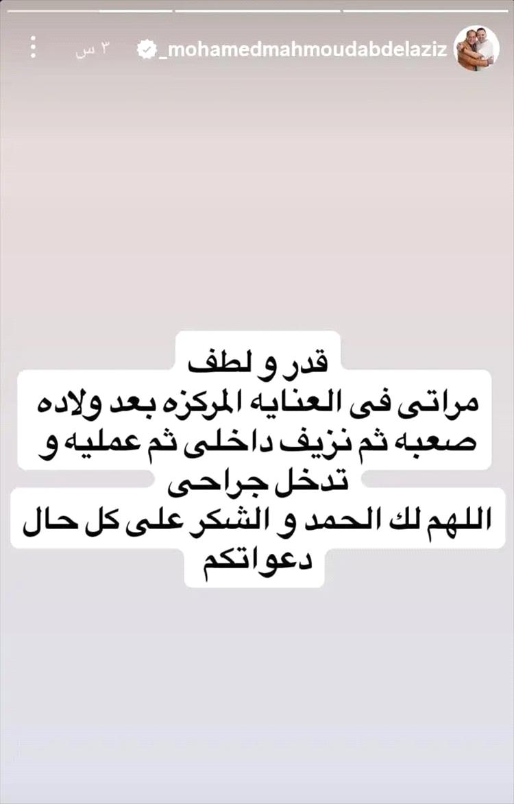 أعلن الفنان محمد محمود عبد العزيز عبر خاصية القصص المصورة الملحقة على حسابه الخاص بـ"إنستغرام" عن تعرض زوجته لأزمة صحية خطرة عقب الولادة وتعرضها لنزيف ودخولها العناية المركزة، حيث كتب قائلاً: "قدر ولطف، مراتي في العناية المركزة بعد ولادة صعبة ثم نزيف داخلي ثم عملية وتدخل جراحي، اللهم لك الحمد والشكر على كل حال، دعواتكم".