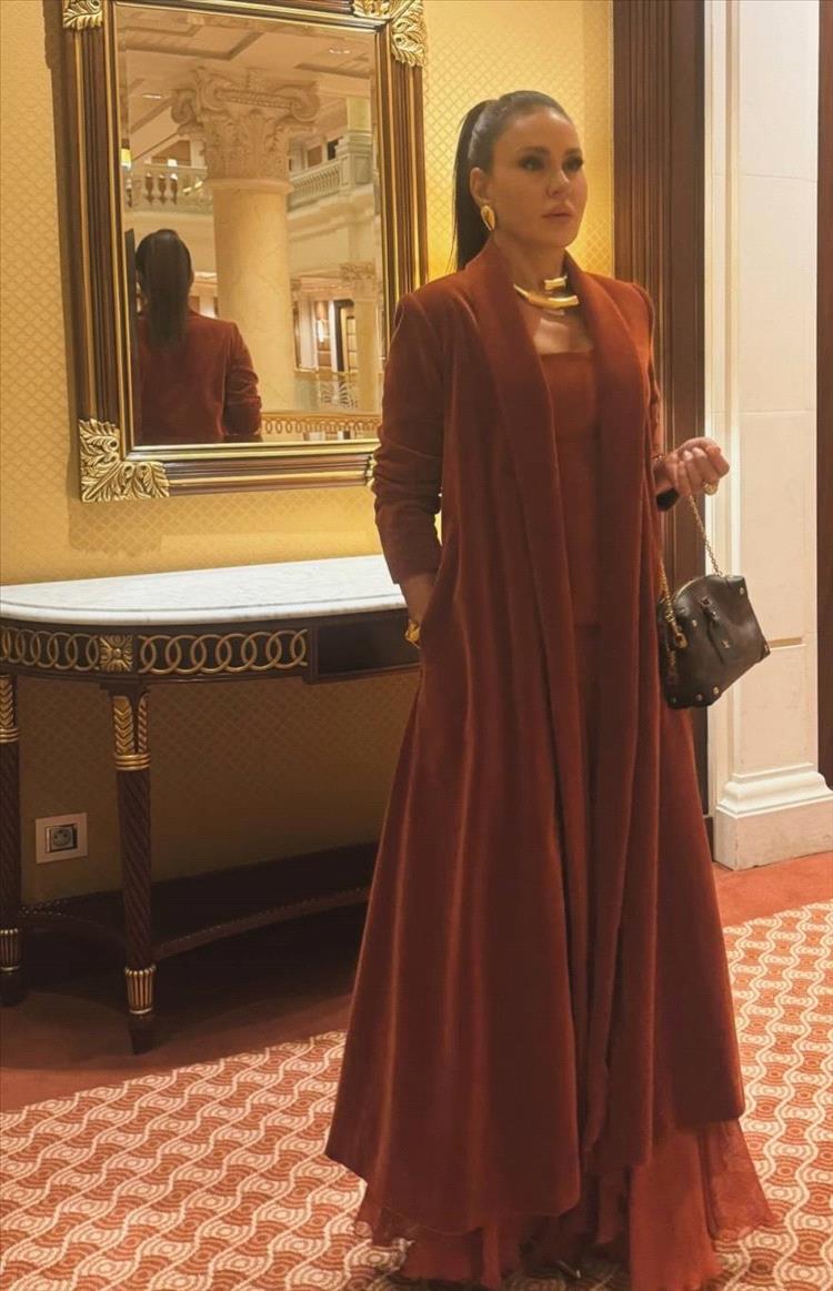 واختارت النجمة السورية إطلالتها من كارولين لانغ باللون "البريك" Brique، عبارة عن فستان طويل وواسع من المخمل الفخم بتصميم انسيابي مريح، وارتدت فوقه معطفاً طويلاً مستوحى من طابع العباءة الشرقية الكلاسيكية بقصّة ناعمة وبتفصيل الياقة العريضة.