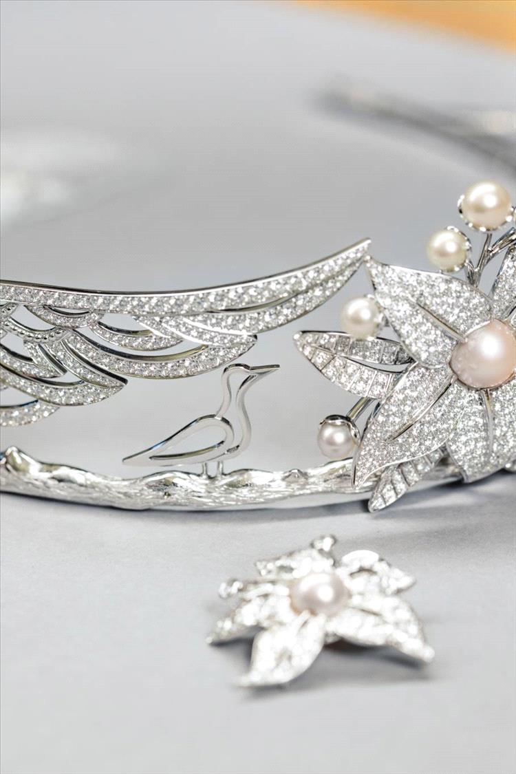 يُشكّل تصميم العطيّة الفائز، "تاج ملاذ الحبارى"، شهادةً على جمال الجذور الثقافية لمُصمّمته، وهو يُحاكي تصاميم "شوميه" الطبيعيّة. هذا التاج مُستوحى من المناظر الطبيعية الخلاّبة في قطر، واللؤلؤ، والتراث الثقافي الغني، ليروي قصة آسرة، تبدأ باكتشاف نبتة العوسج المرن، التي تزدهر في البيئة الصحراوية القاسية. ثمارها التي تُذكّرنا باللؤلؤ، مع أزهارها البيضاء والأرجوانيّة الرقيقة، معروفة بخصائصها الطبيّة، في حين تُشكّل فروع النبتة المُتشابكة، والتي تُستخدم تقليدياً في صناعة مغازل التطريز، الأساس المُعقّد للتاج. يحتفل التصميم الرائع أيضاً بتقاليد الصيد بالصقور في قطر، مُستحضراً الملجأ الذي يجده طائر الحبارى بين أغصان الأشجار خلال موسم الصيد. يتزيّن هذا التاج بلآلئ طبيعيّة استثنائية من الخليج، تكريماً لتقليد اللؤلؤ الفاخر لدى "شوميه". كما يُجسّد تراث قطر الغني في صيد اللؤلؤ، والذي تُمثّله اليوم دور تجارية عريقة مثل عائلة الفردان ومؤسّسها حسين الفردان، المعروف بشغفه باللؤلؤ عالمياً.