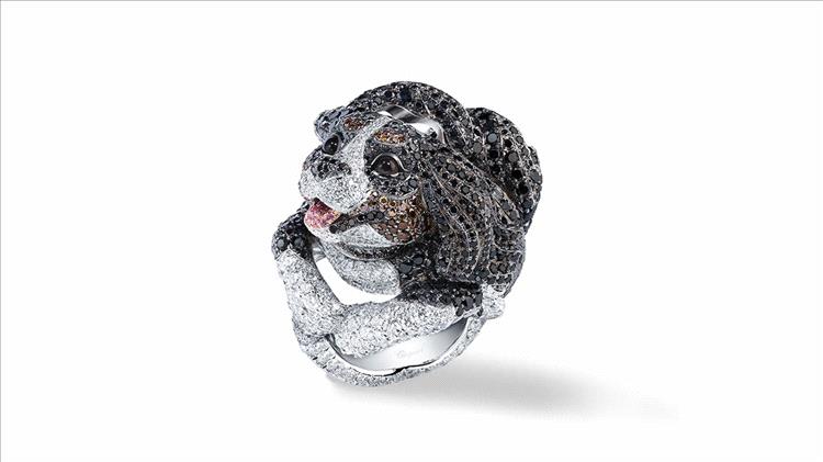 يتميز خاتم بايرون كافاليير كينغ تشارلز بتفاصيله الدقيقة، وهو من القطع الرائعة لمحبّي الكلاب. مصنوع من الذهب النقي عيار 18 قيراطاً، أصفر وأبيض ووردي، مرصّع بألماس أبيض وأسود وكونياك وردي، بوزن إجمالي 12.65 قيراطاً، بالإضافة إلى ياقوت وردي. عيناه مرصّعتان بأحجار العقيق الكابوشون، وهو تحفة فنية رائعة وفريدة من نوعها.