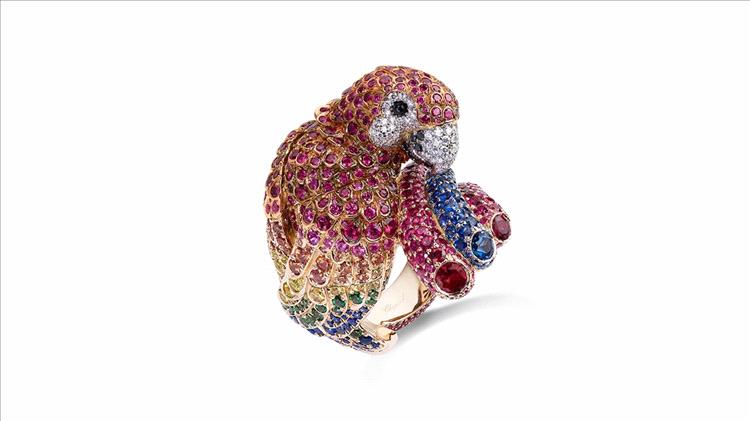 يعتبر خاتم الببغاء من القطع المميزة التي أبدعت "شوبارد" في تصميمها، نظراً لتفاصيلها الدقيقة والرقيقة، وهي من الذهب الوردي والأبيض عيار 18 قيراطاً، والخاتم مرصّع بأحجار ياقوت بريليانت (4.92 قراريط)، وياقوت أزرق متعدد الألوان (2.84 قيراط)، وألماس أبيض وأسود وعقيق أحمر. أما عيناه فمرصّعتان بأحجار أونيكس كابوشون الفاخرة، وهو ما يجعله من القطع المميزة والغريبة لهذا العام.