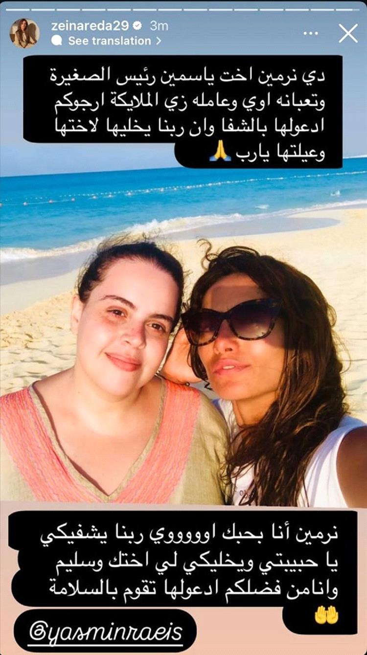 نشرت الفنانة زينة، عبر خاصية القصص المصوّرة الملحقة بحسابها الشخصي في "إنستغرام"، صورة جمعتها بنرمين رئيس، شقيقة الفنانة ياسمين رئيس، طالبةً من جمهورها الدعاء لها بالشفاء بعد تعرّضها لأزمة صحية، متمنيةً أن تتخطّى هذه الأزمة بسلام.