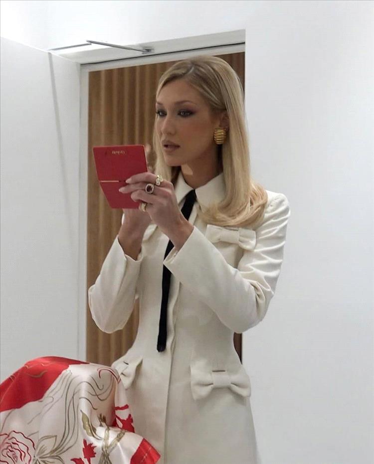 وتولّت ميمي كاتريل، منسّقة أزياء المشاهير وزميلة حديد في العمل تنسيق إطلالتها. ونتيجةً لذلك، جاء الفستان القصير مزيجاً مثالياً بين الأناقة والطابع الكلاسيكي بتفاصيله الجذابة، بما في ذلك فُتحة الرقبة وزينة "فيونكة" عند الخصر. نسّقت الإطلالة مع حذاء أبيض من داكوري "ديفا" وأقراط عتيقة من "جيفنشي" أيضاً.