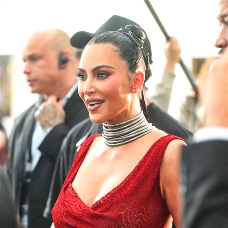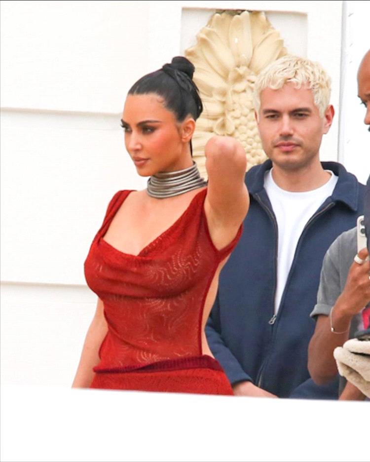 اتّجهت الأنظار نحو مؤسِّسة Skims، التي تألقت بفستان أحمر فاتن، يتميز بفُتحة رقبة واسعة، وصدرية شفّافة، وتنورة ضيّقة تلامس الأرض، وظهر مفتوح تماماً يصل إلى وركيها. ونسّقت الفستان مع حذاء أسود بكعب عالٍ وطبقات من القلائد الفضّية التي أضفت عليه مظهر الياقة.