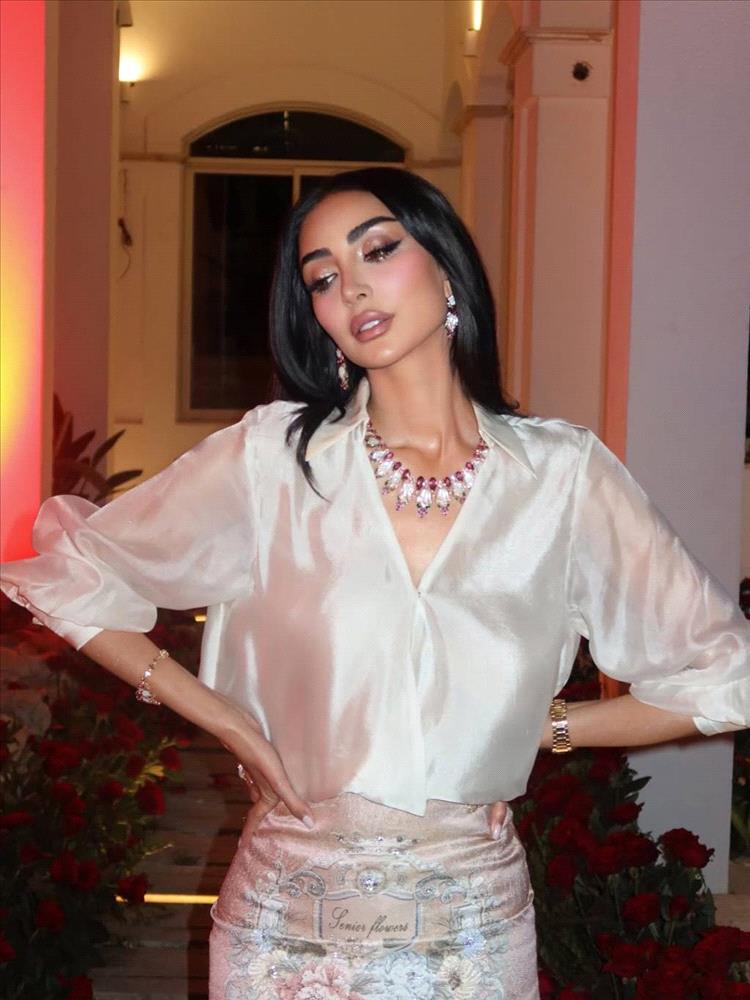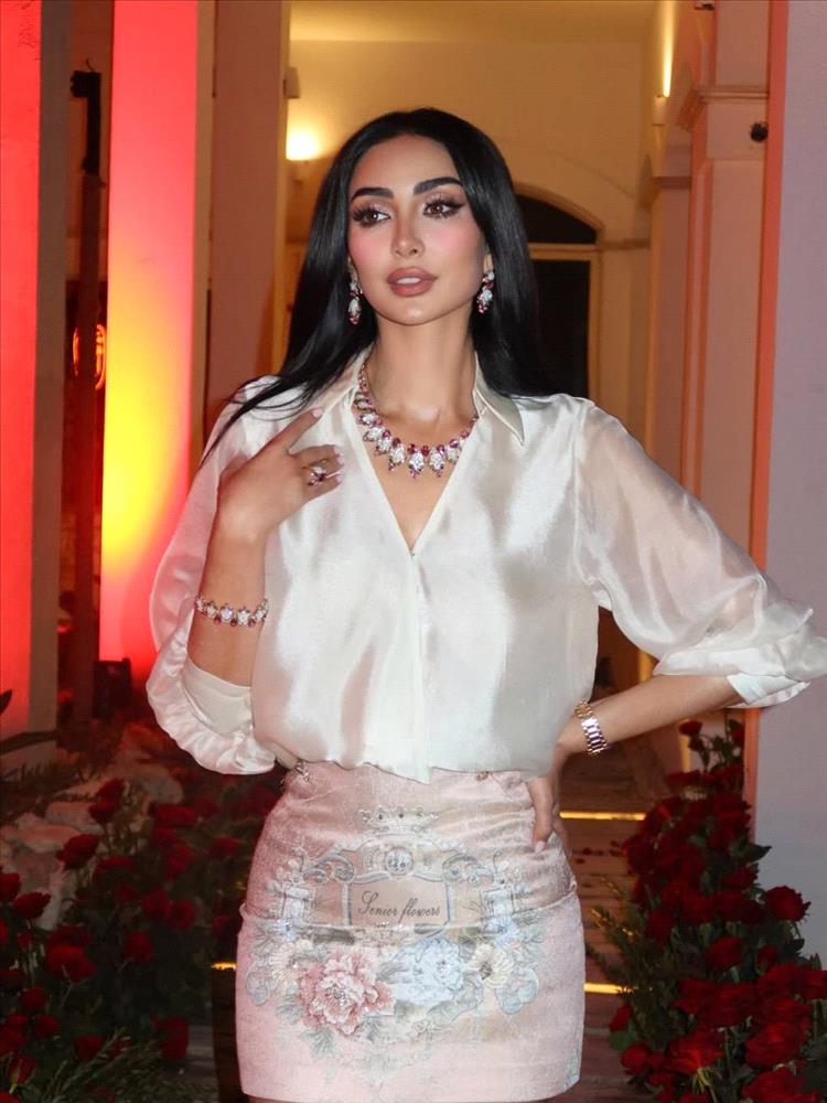 نسّقت نور القميص مع تنورة قصيرة ضيقة باللون الوردي الباستيلي، وهو لون يعكس الرومانسية والرقي. تميّزت التنورة بتفاصيل مزهّرة بطريقة فنية ناعمة، مما منح اللوك حركة جميلة وحسّ ربيعي أنثوي. هذا المزيج بين الأبيض والوردي الباستيل خلق انسجام بصري مميز وهادئ.
